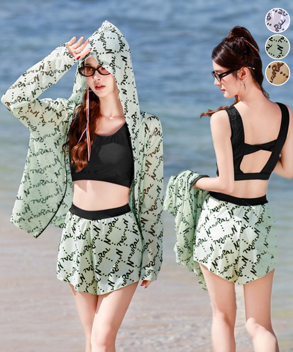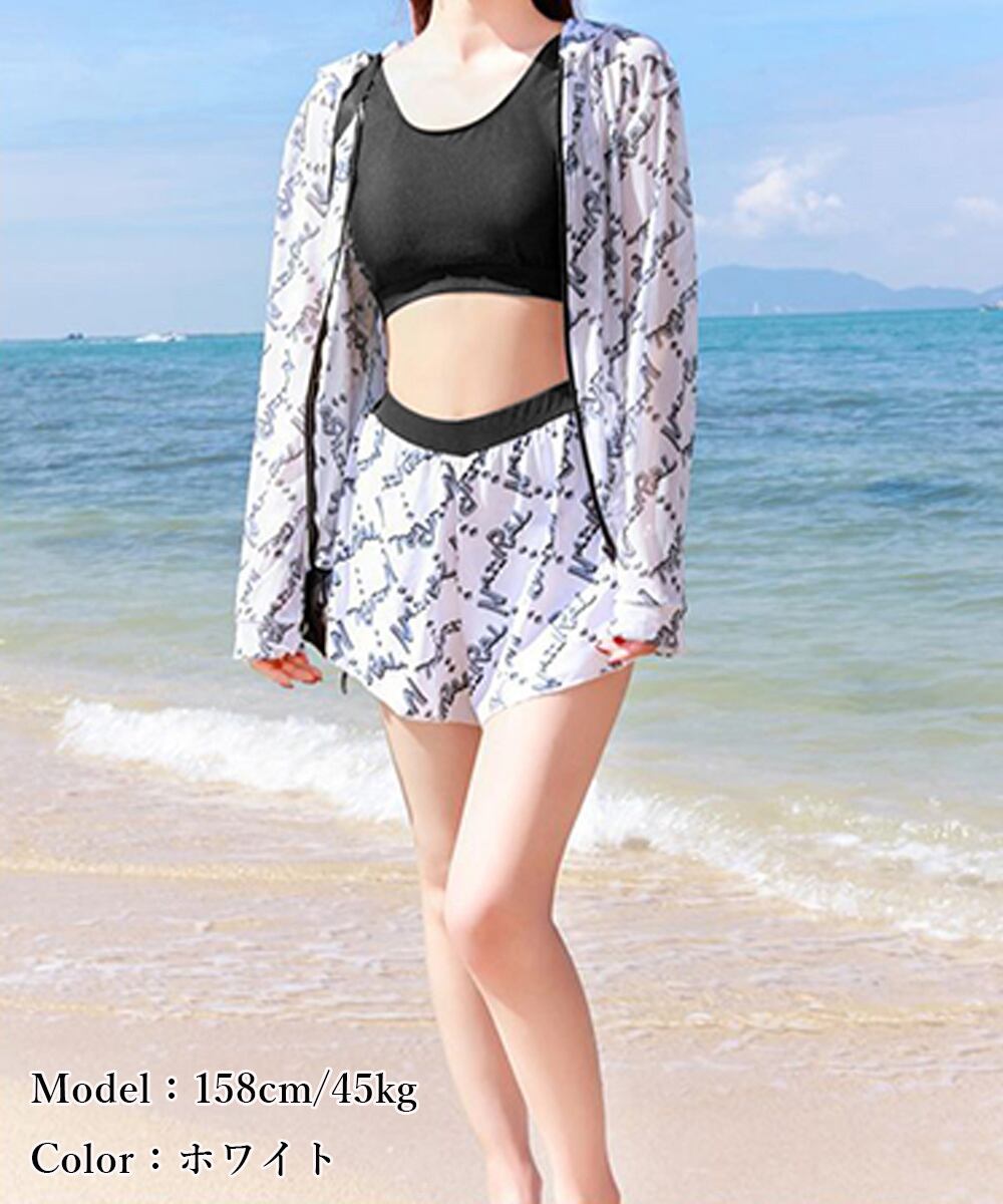 露出控えめ 水着3点セット 大人可愛い スイムウエア 英字柄 セパレート水着 日焼け防止 ラッシュガード付き 体型カバー