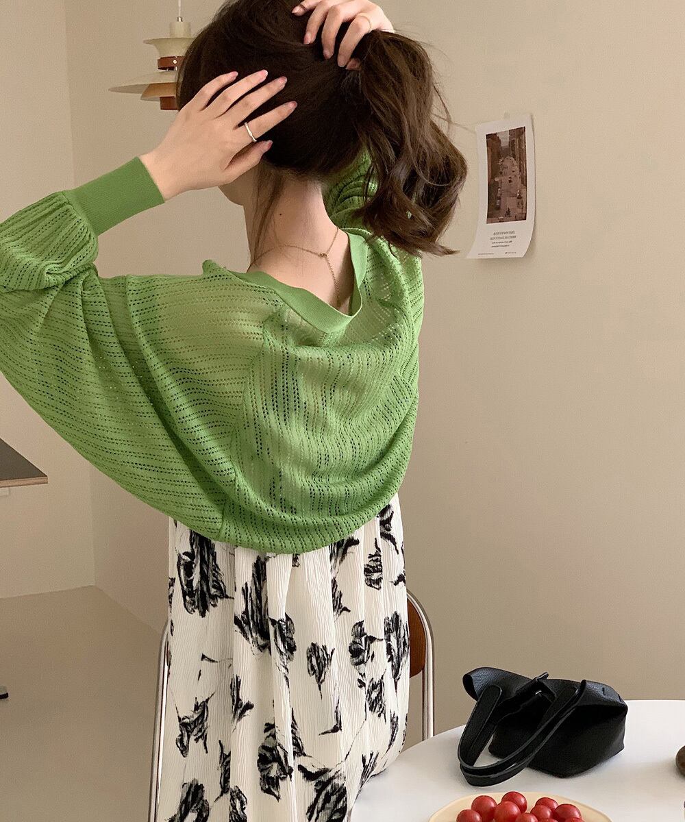 レディース クロップド丈 透かし編みニットカーディガン 冷房対策 ゆったり体型カバー 春夏長袖羽織 韓国風メッシュニット